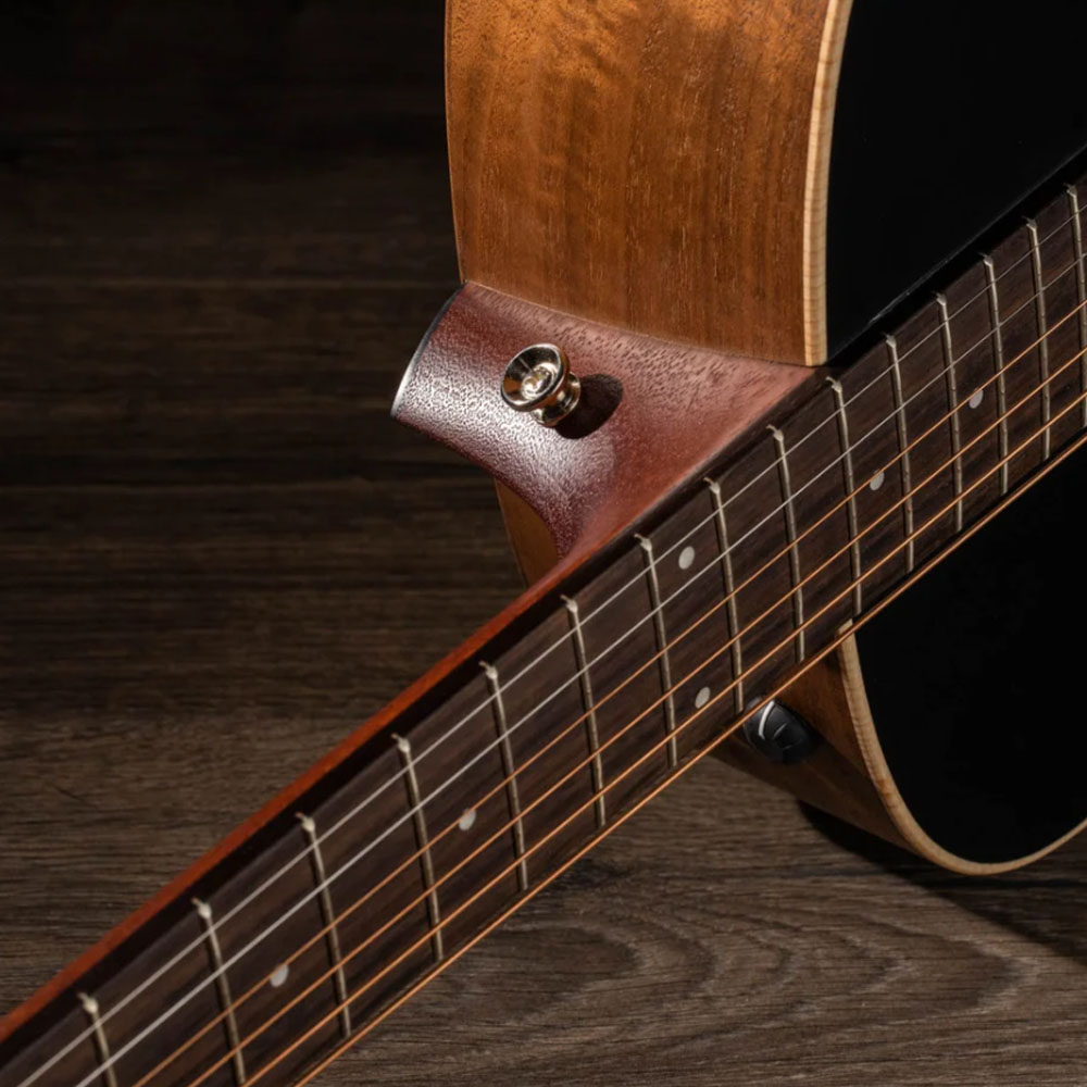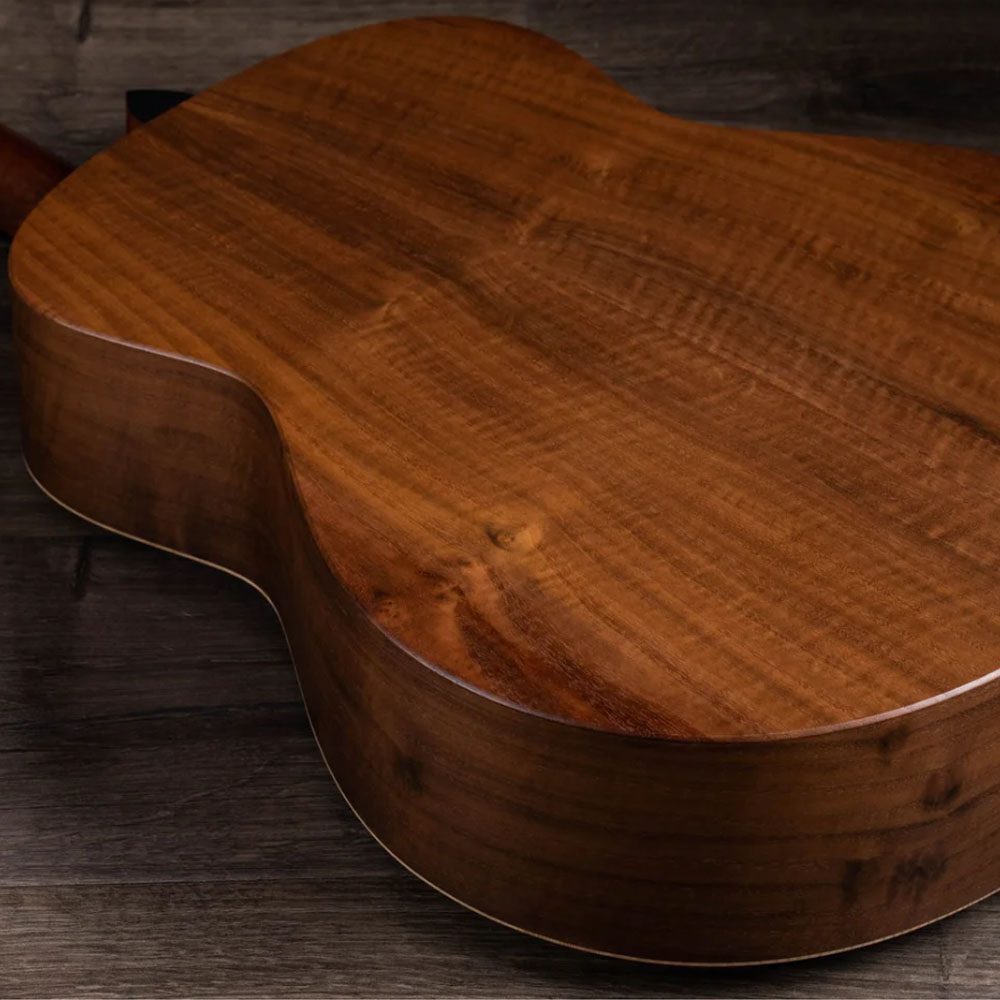• 胡桃木背側板(Solid Walnut Back & Sides) — 音色乾淨、溫暖,中頻突出,並隨著演奏時間增添低頻張力。